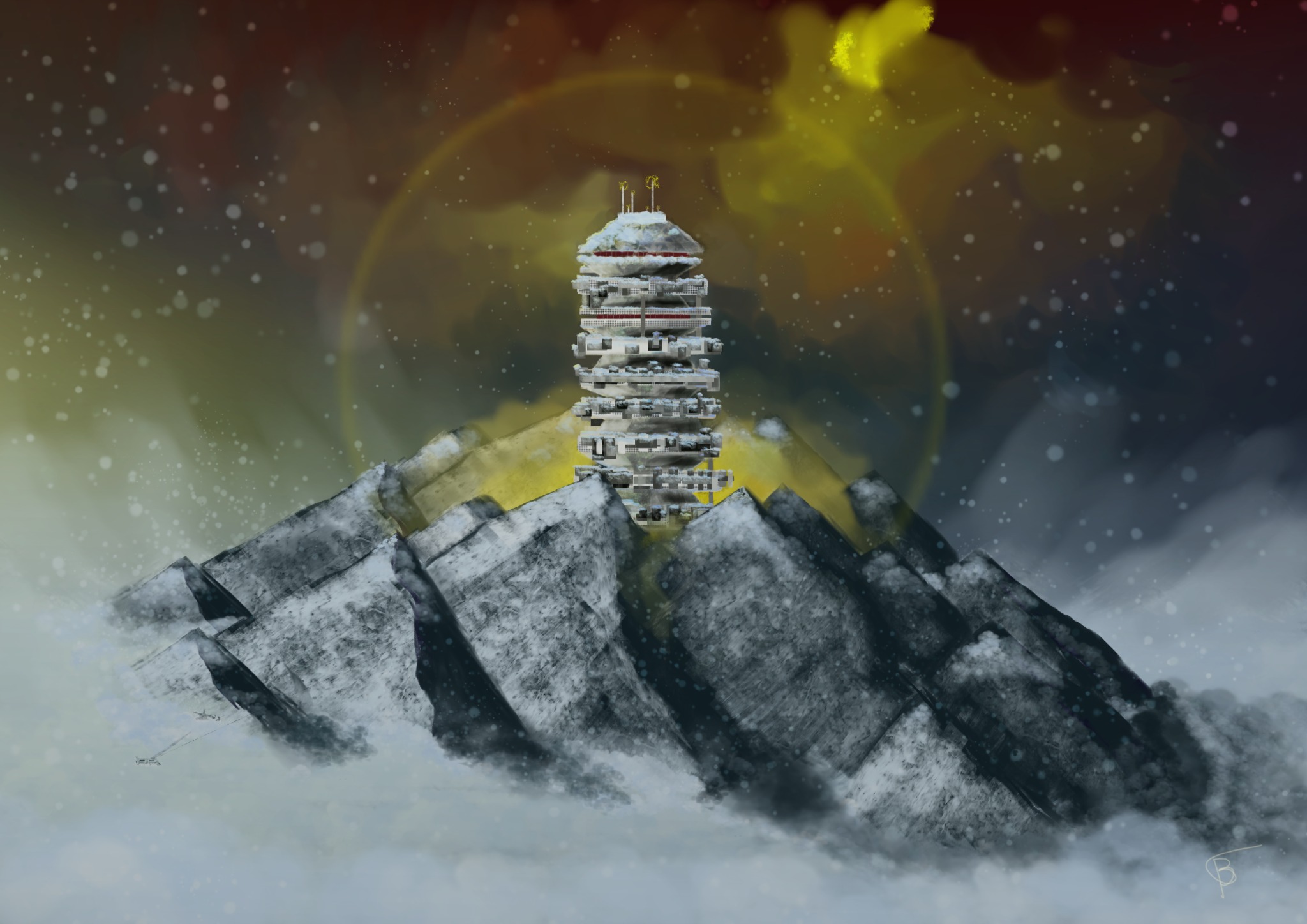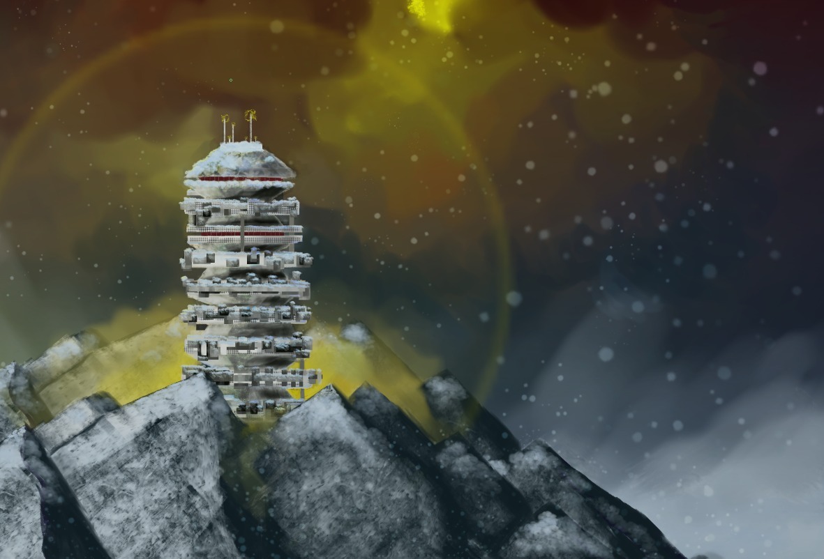 "Arcology", digital painting, A3. First attempt digitally applying skills learned during the Bob Ross project (plus the greebling techniques popularized by LucasArts) in another context. Made for homemade RPG module "The Invisible Hand".