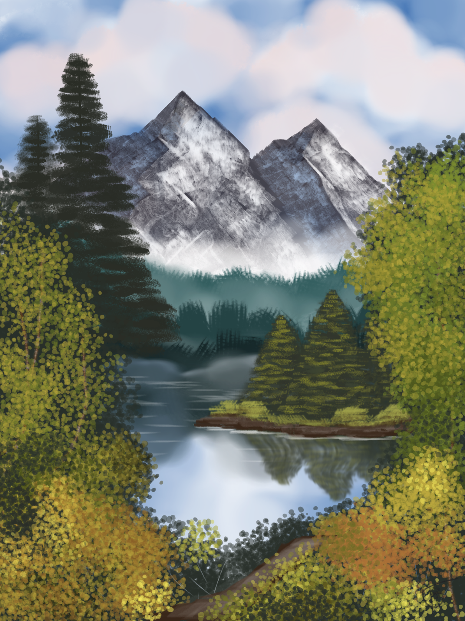 "Mystic Mountains Mimicry", digital painting, 18x24-inch digital canvas. My attempt to mimic one of Bob Ross' most famous paintings, and one of my first digital works (hence it being in a different style from the works above).